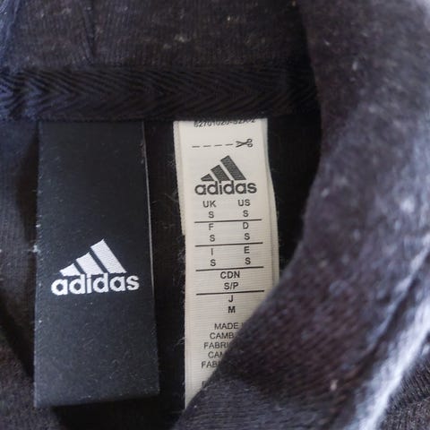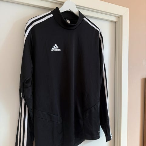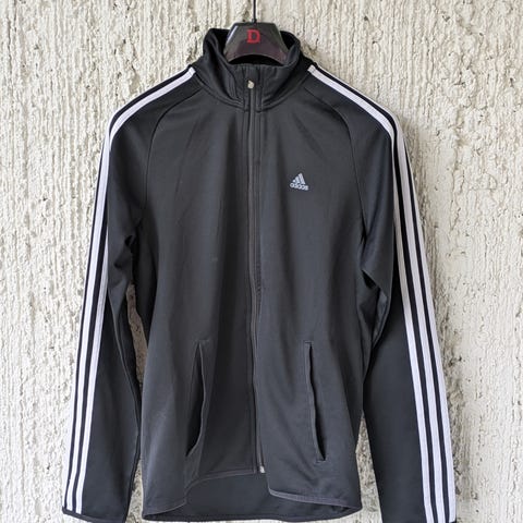 Adidas langermet herregenser i størrelse S, grå farge med svarte striper på ermene og stort svart Adidas-logo på ryggen. Laget i pustende materiale egnet for trening og fritid.