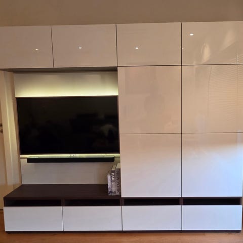 Vi selger vårt Bestå modulsett fra IKEA. Møbelet er veldig pent brukt med nesten ingen bruks skader. Tegningen fra IKEA er hva som medfølger, vi har endret litt på det da vi har flyttet og ikke hadde plass til alt sammen ved siden hverandre. Det er bygget opp av 5 seperate seksjoner som kan plasseres etter eget ønske eller sammen som på tegning. Det føler også med 2stk glassplater på toppen av "TV benken" hvor en dekker 3 døråpninger (2 seksjoner) og en som dekker 2 døråpninger (1 seksjon). Medfølger også belysning i glassfeltene på høyskapene.