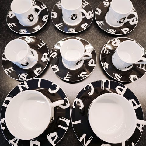 Multiple Choice servise med kopper, tallerkener og skåler. Serviset har et dekorativt mønster med gule og grønne farger. Materialet er porselen.