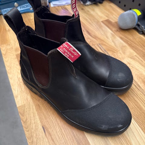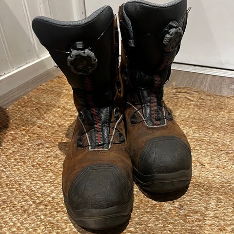 Dr. Martens støvler i størrelse 45, laget av svart skinn. Støvlene har snøring og gummisåle med mønster for grep. Egnet for bruk som hverdags- eller arbeidssko.