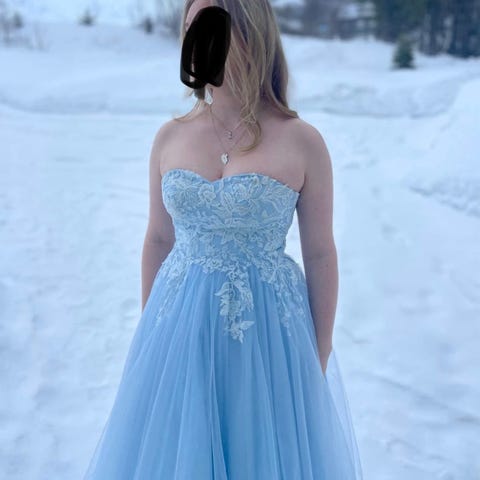 Hun som har på seg kjole er 165cm høy og 90 cm rundt brystet.