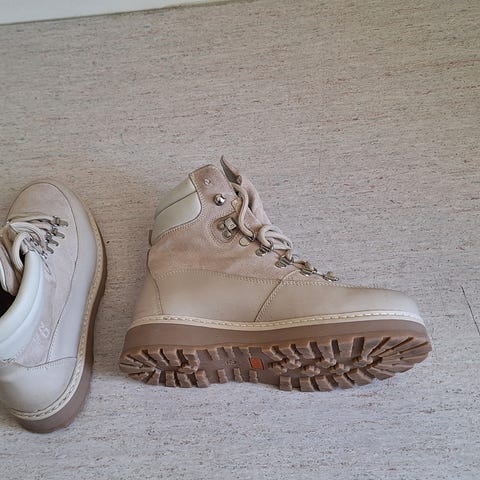 Hike er en sporty og praktisk høst-/vintersko med vanntett og pustende Sympatex-membran. Overdelen er laget i semsket skinn av topp kvalitet. I tillegg har overdelen gummierte partier nederst mot yttersålen, som øker slitestyrken og vanntettheten. Modellen er varmtfôret, og innersålen i ekte ull holder godt på varmen. Det høye skaftet gjør at skoen er stabil, og at den holder enda bedre på varmen i kulda. Yttersålen er myk og fleksibel, samtidig som den er stabil og har et veldig godt grep. Gummien på undersiden av yttersålen øker slitestyrken og forsterker grepet. Den bærekraftige Sympatex-membranen gjør at skoen er 100% vanntett og pustende.Kjøpt for 1999,brukt en gang på butikken kjenner at de ble litt små så er som nye