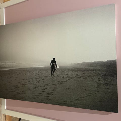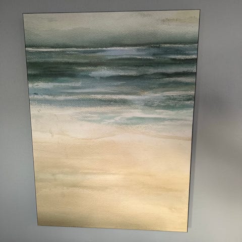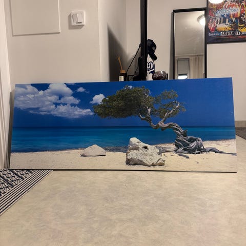 IKEA dekorasjonsbilde med landskapsmotiv. Bildet har en ramme i tre og viser en naturinspirert scene med trær og vann.
