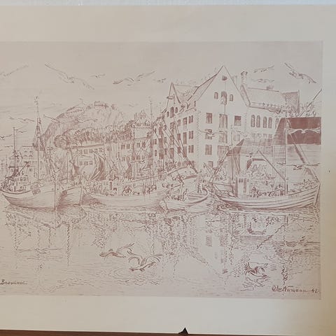 Signert kunsttrykk som viser et bygg i brosundet muligens rønnebergsbua eller annet bygg, innrammet og klar for oppheng.