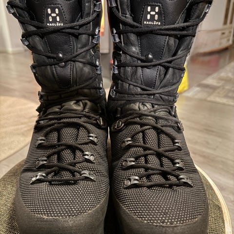 Haglöfs GorTex sko i størrelse 39, designet for fottur. Skoene har svart farge og er laget for utendørs bruk.