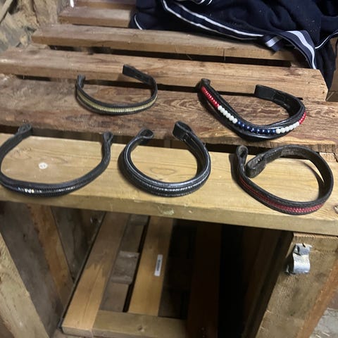 Pannereimene har preciosa krystaller, buet form, svart lær størrelse cob (passer også en liten/vanlig full) da de er ganske romslige. De har også borrelås slik det er enkelt å bytte, å tilpasse til alle hodelag. Alle er nye.
