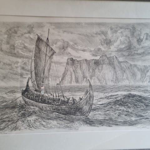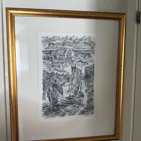 Innrammet grafikk som viser fembøringer på Vestfjorden under Lofotfisket, slik Johan Bojer har beskrevet det i boka Den siste viking.