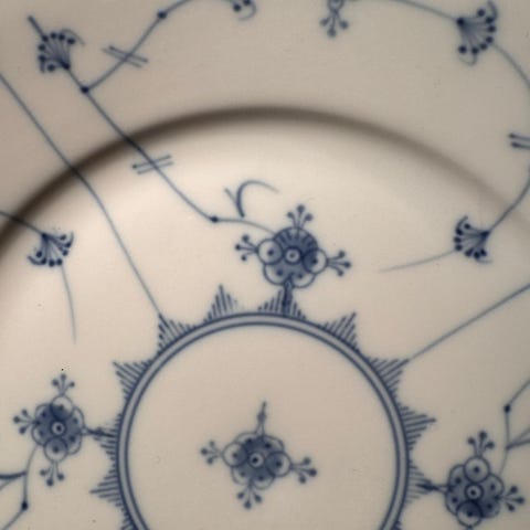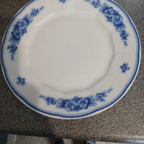 Klassisk tallerken fra Porsgrund, produsert i 1961. Hvit glasur med blå kant og et tidløst, skandinavisk uttrykk. Passer både til daglig bruk og som del av et vintage-servise.