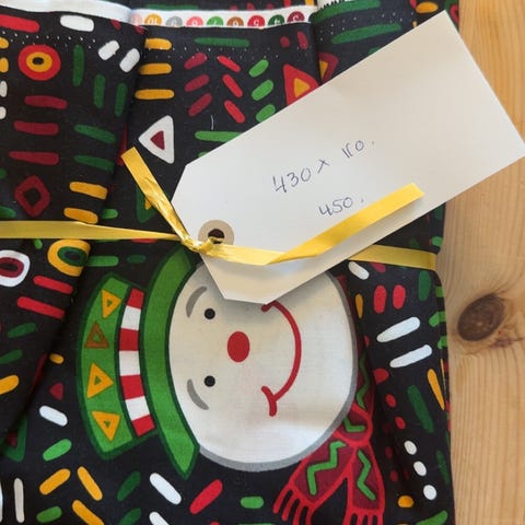 Blått bomullsstoff med "ruglete" overflate (lille Martine?) med store hvite polkadotter. Har noen striper/feilprint , men det er mye brukbart stoff igjen. Bredde 87 cm, lengde 370 cm.