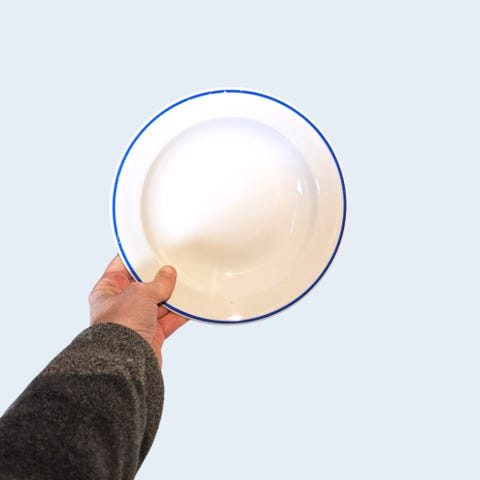 Klassisk tallerken fra Porsgrund, produsert i 1961. Hvit glasur med blå kant og et tidløst, skandinavisk uttrykk. Passer både til daglig bruk og som del av et vintage-servise.