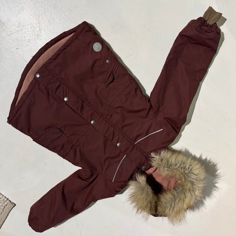 Ny En Fant vinterjakke i størrelse 116 for jente. Jakken har lilla farge med mønster og er designet for barn. Materialet gir beskyttelse mot værforhold og passer til utendørs bruk. Selges 750 kr
