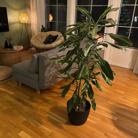 Monstera Deliciosa stueplante med store grønne blader, trenger kjærlighet