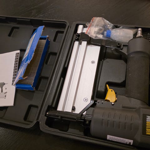 Selger en trykkluftdrevet stiftepistol, levert i original koffert. Pent brukt og komplett, med medfølgende stifter (se bilder).