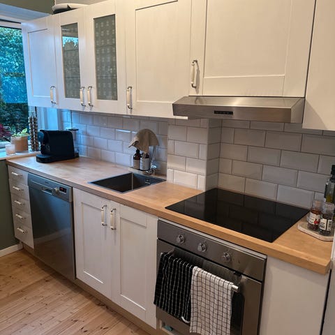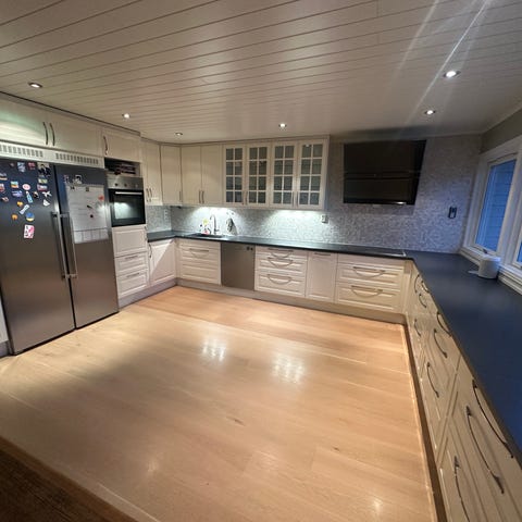 Kjøkkenet har mål som vist på bildene, med standard dybde på skap og benkeplate.