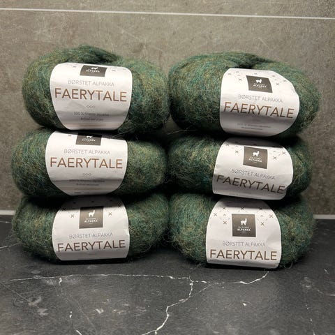 7 bunter Sandnes Garn Faerytale garn i gul farge. Mykt garn som Inneholder mohair og ull, gir et luftig og varmt resultat. Fargen heter gullgul. Alt er i samme innfarging.