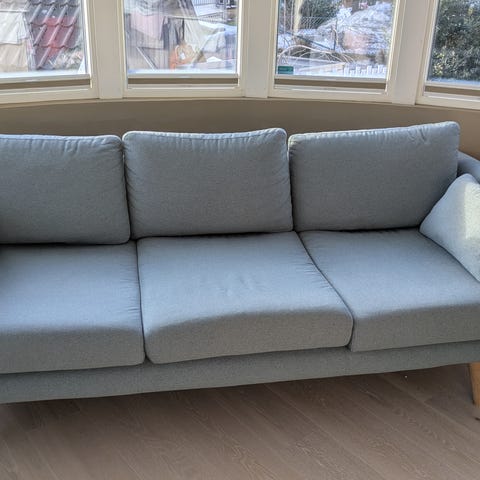 Sofaen er kjøpt på Bohus i 2018 for ca 10 000,- og er i melert lys rosa med eikeben.