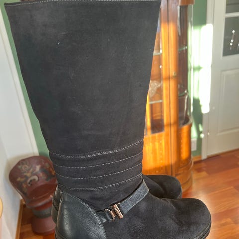 Pen støvler av semsket skinn med wedge heel og fuskepels på toppen.