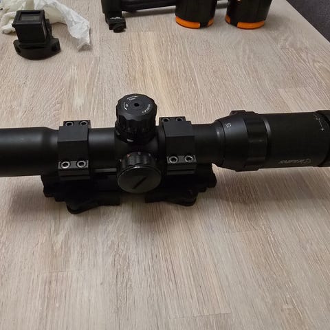 Strike Systems rødpunkt sikte med justerbar lysstyrke og monteringsbrakett. <-- (SOLGT) Og et annet sikte usikker merke. Passer for bruk på ulike våpen med standard skinnefeste. Laget i robust materiale for presis sikting under forskjellige forhold.