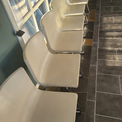 7 stk spisestuestoler selges for 2000 for alle sammen. Jeg har trekt om stoffet til hvitt teddyfor.