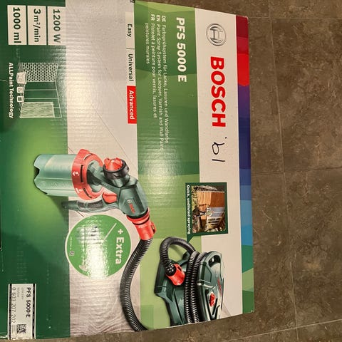 Bosch PFS 5000 E sprøytemaling med 1200 W effekt. Produktet har en kapasitet på 1000 ml og er utstyrt med AllPaint Technology. Farge: grønn.