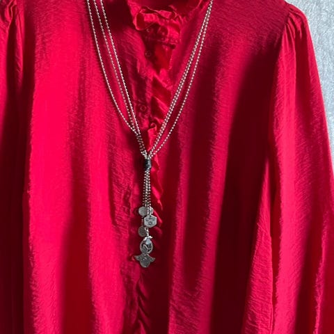 Langt sølvfarget kjede.
