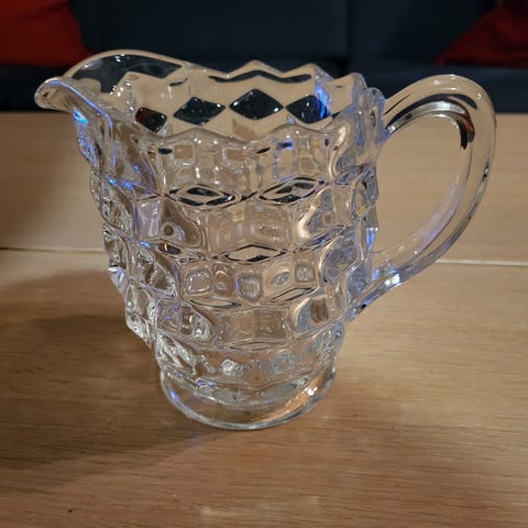 Magnor Glassverk glasskrus i klart glass med dekorativt mønster. Egnet for servering av varme og kalde drikker.Selges til 100 kr