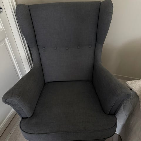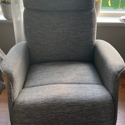 Lenestol med innebygd fothviler, sving og vipp. Ryggen på stolen kan legges ned, slik at den er god å ta en middagshvil i. Den er hel-trukket med mykt skinn. Dessverre er det en liten sprekk i skinnet øverst ved hodet.