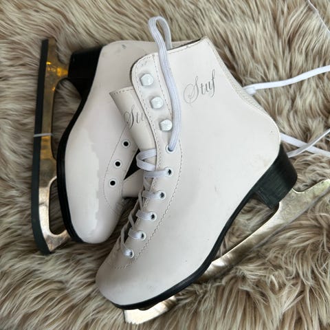 Skøyter for barn i størrelse 30-33 (justerbar). Skøytene har svart og hvit farge og er utstyrt med justerbare spenner for god passform.