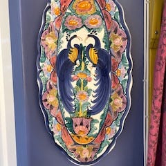 Bordallo Pinheiro fiskeformet fat i keramikk med blå dekor. Fatet har en unik form som ligner en fisk, og er egnet for servering eller som dekorativt kjøkkenutstyr.