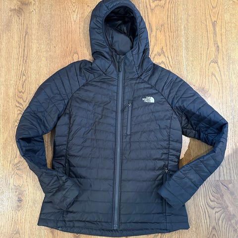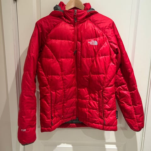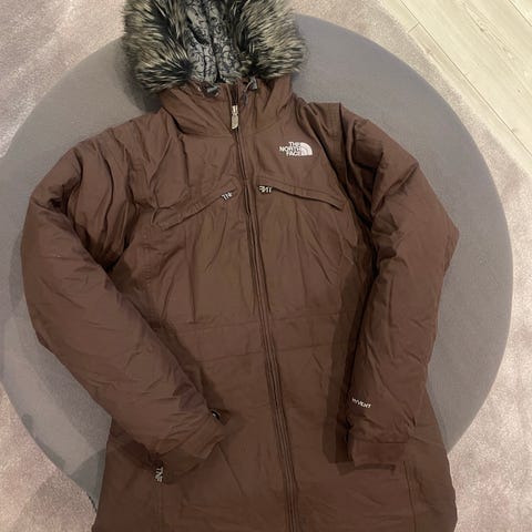 The North Face dunjakke i størrelse L for kvinner. Jakken er lilla og laget av dun, egnet for kaldt vær.