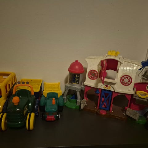 Fisher-Price bondegård leke med tilhørende dyr og en bondefigur. Inkluderer bondegård og alle figurene. Pent brukt, lys og lyd osv funker som det skal.