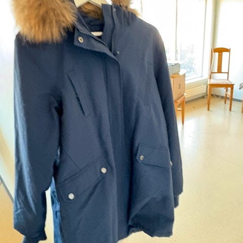Blågrå vinterjakke med teddyfor. Avtakbar fuskepels på hette. Olje/voksbehandlet ytterstoff. PVC belagt innside. Jakka kan kneppes ned bak. Se bilde. Et bittelite hull på en arm. Se bilde. God og varm. Magnet istedenfor knapper for å lukke lommene.