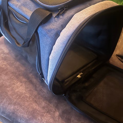 Instinct hundebur laget i stoffmateriale med nettingvinduer på flere sider for god ventilasjon. Buret har en rektangulær form og en kombinasjon av beige, brun og svart farger. Egnet for bruk som transportbur eller hvileplass for hunder.