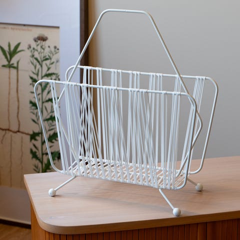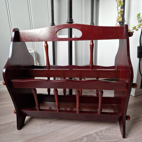 Pent og dekorativt vintage magasin- og avisstativ / til oppbevaring til barnebøker leker. Trolig fra 1960–70-tallet, i klassisk skandinavisk stil. Stabil ramme i rundt treverk.