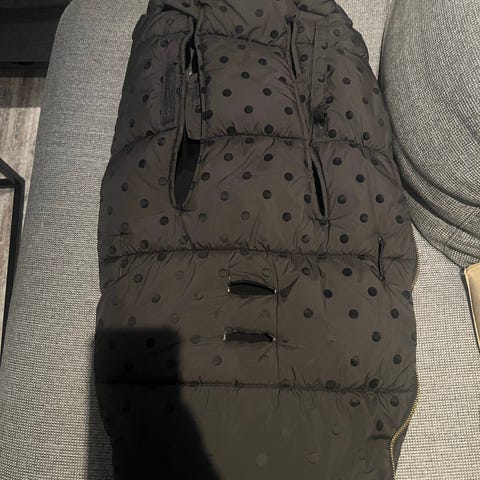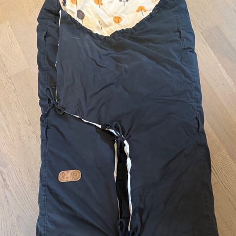 Petite Cherie barnevognpose i blå og hvit farge med mønster. Laget av polyester og fleece materialer. Designet for bruk i barnevogn med åpninger for sikkerhetsbelter. Kan maskinvaskes på 40 grader.