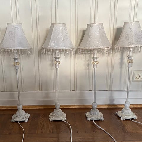 2 stk. stilrene bordlamper i krom med grå fløyelskjermer