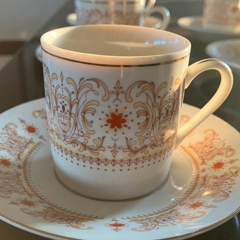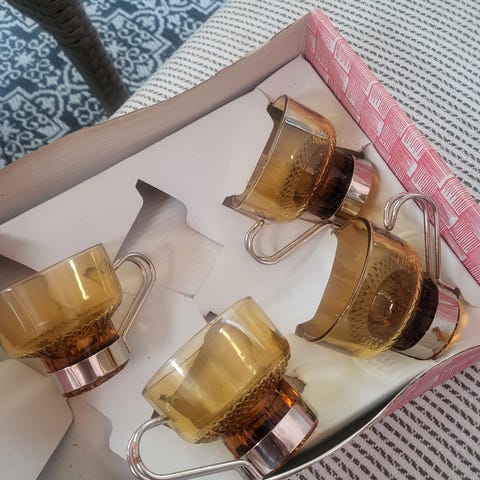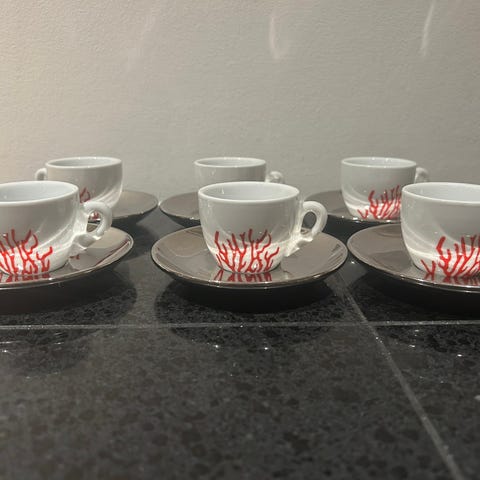 Sett med 6 glasskopper og tilhørende fat i assorterte farger. Kopper er laget av klart glass med fargede underlag i gul, grønn, blå, rosa, rød og brun. Passer til servering av kaffe. Fra Italia