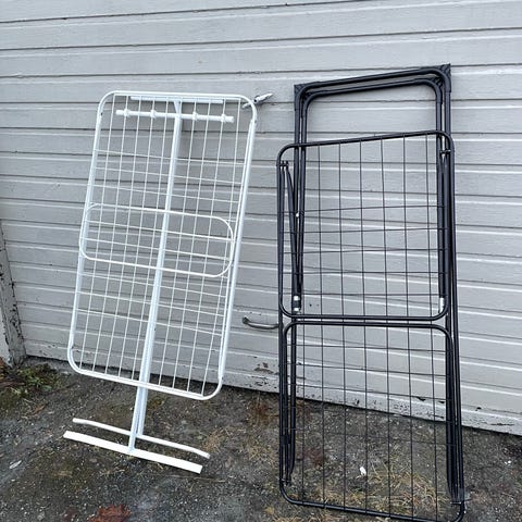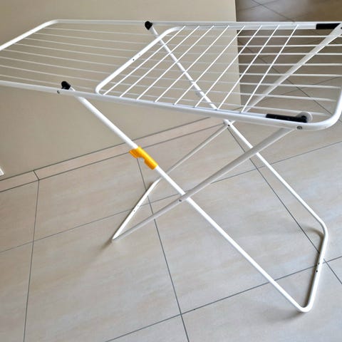 Tørkestativ i hvitt metall med flere nivåer for tørking av klær. Kan foldes sammen for enkel oppbevaring og sparer plass når det ikke er i bruk.