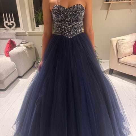 Mørk blå ballkjole selges. Meget pent brukt, og uten bruksmerker. Tilpasset i høyden for å passe jente på 164 cm (uten høye hæler). Kjolen er i str 28, og passer både XS’, s og m på grunn av snøring i ryggen som gjør det lett i justere størrelsen.