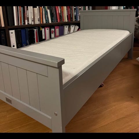 JLY Juniorseng barneseng i grå farge. Sengen har rekkverk på sidene og en skuff under for oppbevaring. Madrass fra Jysk følger med om ønskelig 🛏️