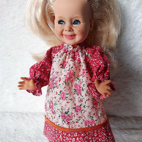 En koselig kjole som blir fin utenpå en topp. Den er nyvasket, strøket, hel og flekkfri, men har litt rust på trykknappene slik vist på bilder.