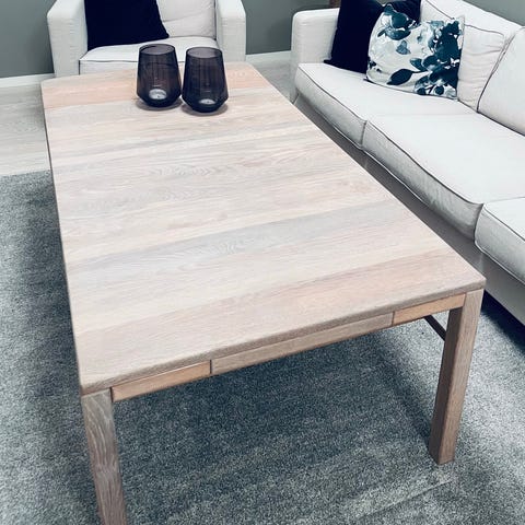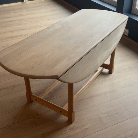 Bordet har litt bruksmerker på topplaten. Har hatt bordet i ca 10år. Kunne nok ha godt av en liten runde med lett sandpapir og litt lakk, så blir det som nytt!