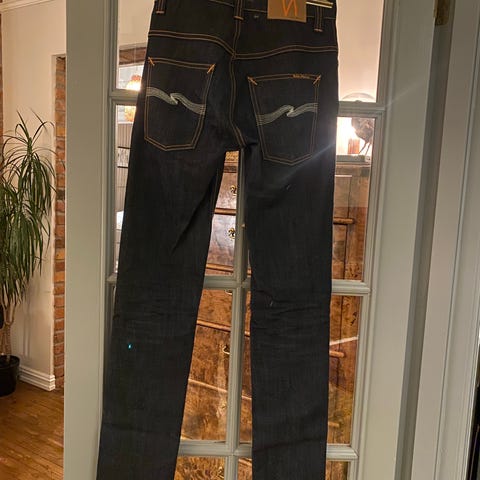Nudie Jeans S jeans i svart farge med midje størrelse W26. Laget av dun materiale. Designet for menn. Ny pris 1300kr