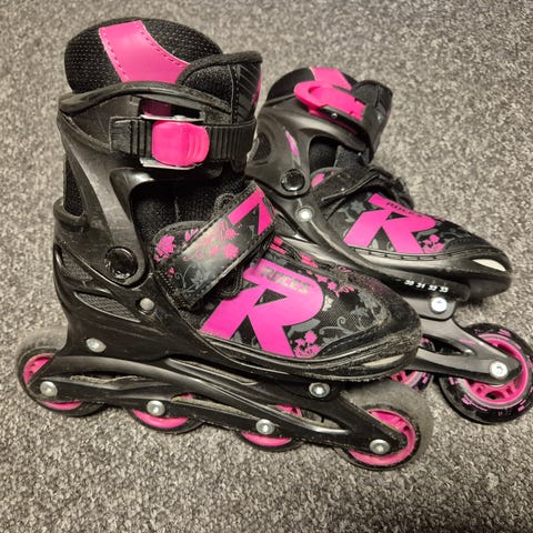 Roces RDX barn rulleskøyter i størrelse 35, med hvit og rosa farge. Skøytene har justerbare spenner og fire hjul i linje, egnet for barn. Synlig brukt, men like hele og mye bruk igjen. Alt fungerer som det skal.