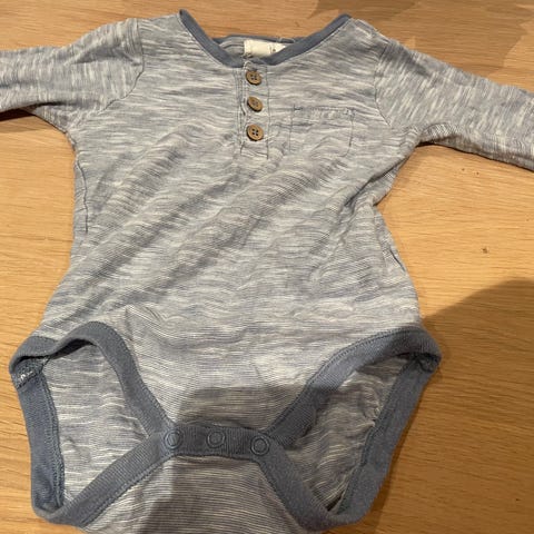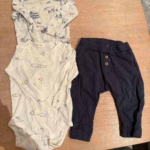 Newbie babyklær for gutt i størrelse 74. Settet består av to bodyer i flerfarget design laget av bomull. Ingen hull, men litt svake flekker på body i beige.