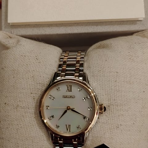 Seiko Dameklokke med en diameter på 30 mm, laget i tofarget stål og gull. Klokken har safirglass, kvartverk og er vannett opptil 50 meter. Urskiven er dekorert med diamanter som tallindikatorer. Designet for damer, kombinerer denne klokken klassisk stil med funksjonalitet.