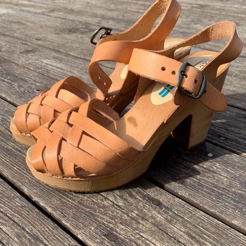 Ubrukte, vakre, klassiske, furu-brune tresko fra svenske Moheda i mykt, kraftig lær og gummitrukket såle i tre. Fine til jeans, shorts, overaller, kjoler med blomster, kjoler med striper, badedrakt, lange skjørt, korte skjørt eller ingenting! Peace&Love!