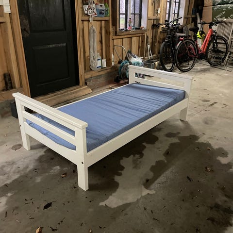 Barneseng på ca 210x100 cm ytre dimensjon selges. Sengen er et dansk merk, mens ribbebunnen er fra IKEA. Den har noe bruksmerker, men fungerer helt fint. Lagringsskuffene er ca 60 cm dype og er frittstående.