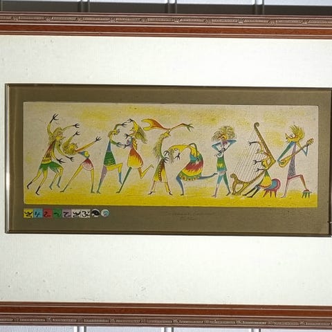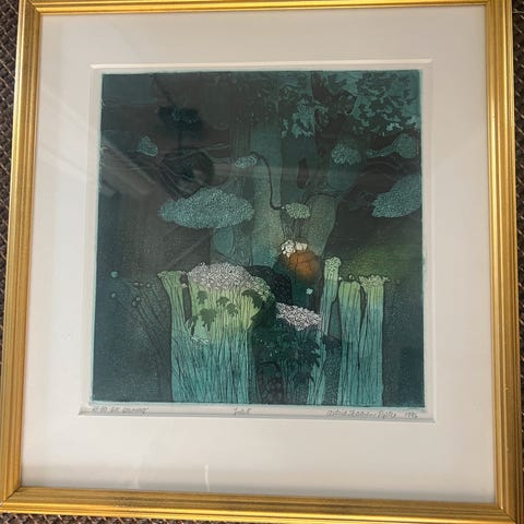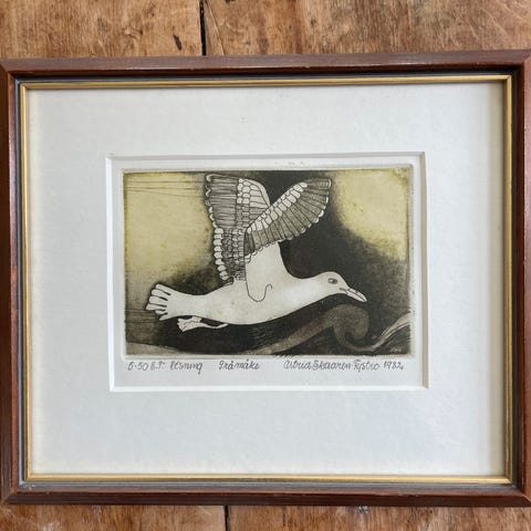 Vakkert trykk (etsing) av kunstneren Astrid Skaaren-Fyrsto. Tittel "Utsikt til Nerjøsund" fra 1982. Nr 43 / 50 eksemplarer. Pent innrammet i gullramme med passpartout og syrefri kartong. Rammemål 41 x 38 cm.