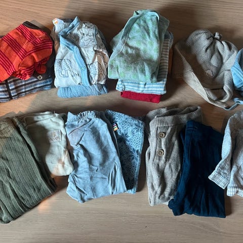 Klespakke i ull størrelse 50-74. Bodies, bukser, strømpebukser, pysj, luer, votter fra merkene; lillelam, hust & claire, joha, reflex, Janus, name it og Cubus.